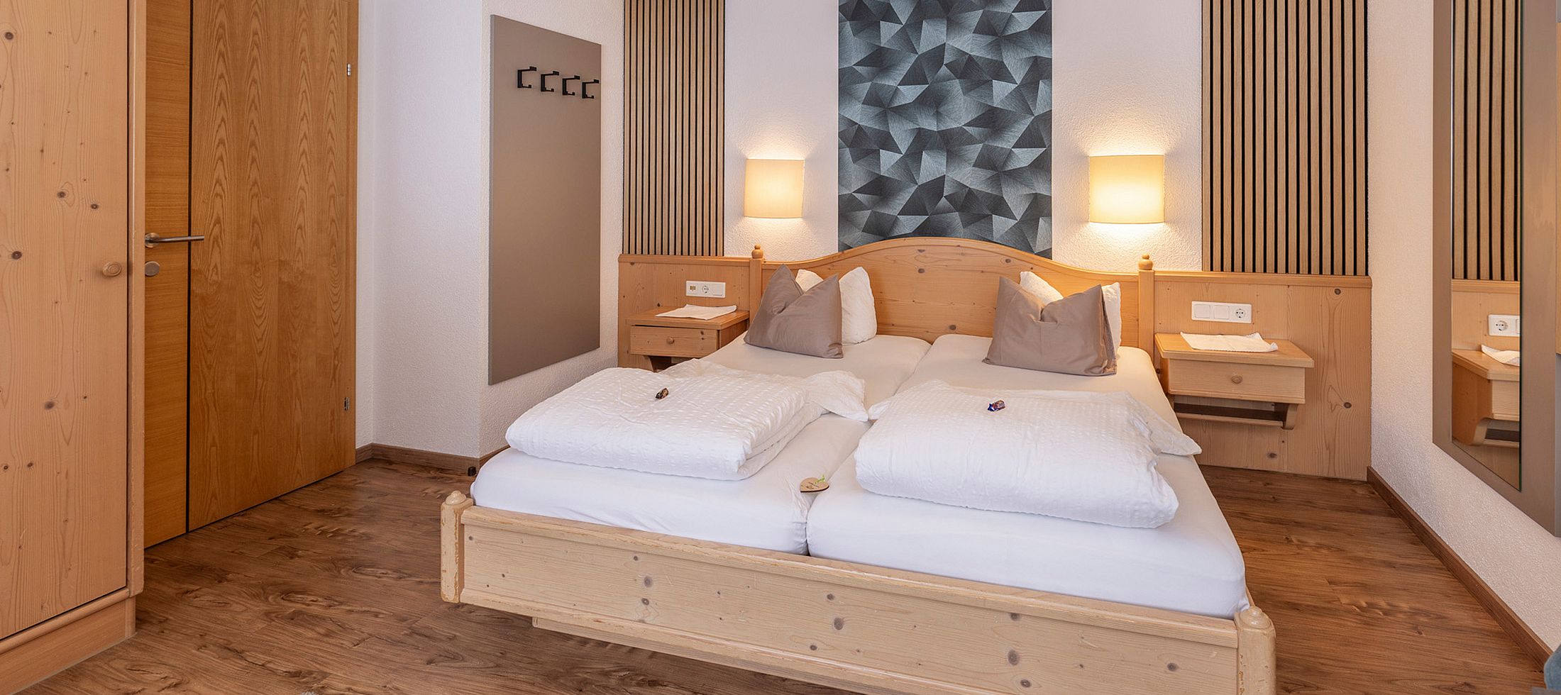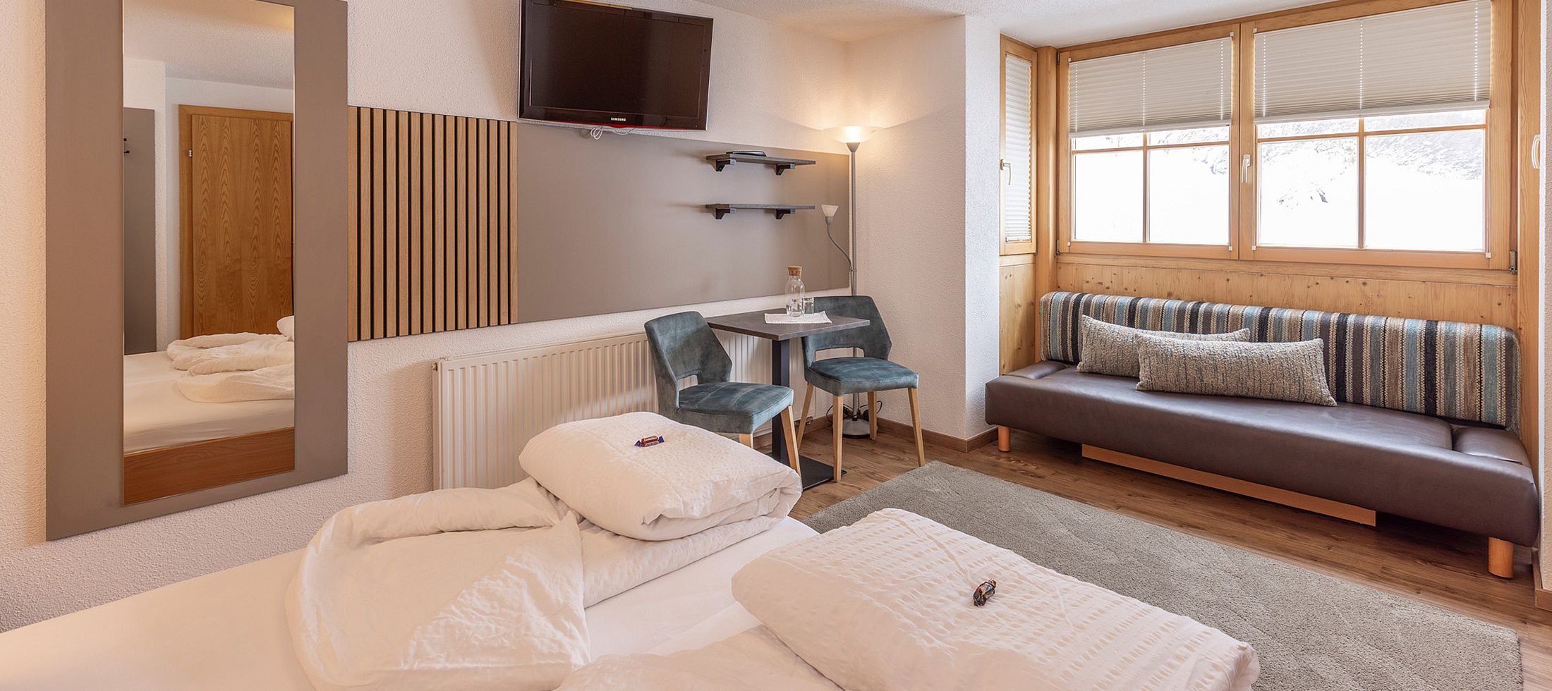 Make yourself comfortable in the bright rooms of category 1. The rooms are equipped with a double bed and a double sofa. The couch can be converted into a sofa bed, so that 2-4 people can be comfortably accommodated. The rich breakfast buffet is included in the overnight price.